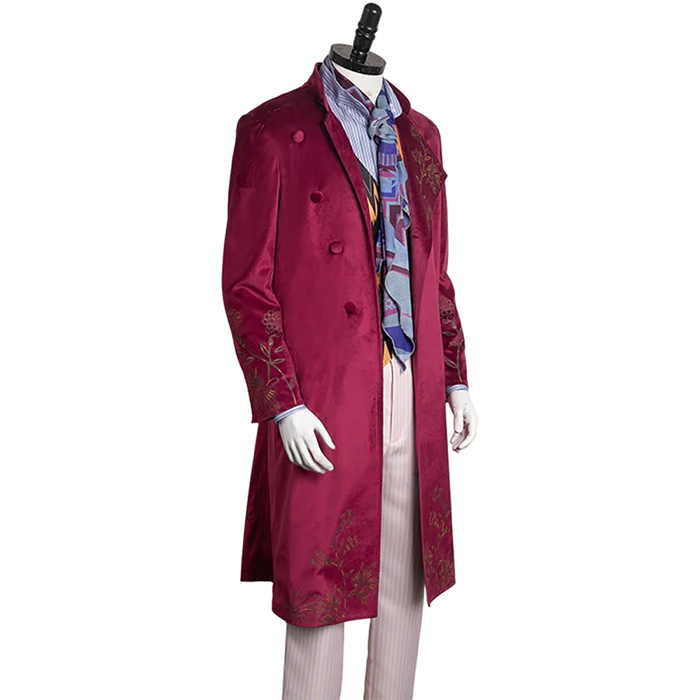 The attire is made of supreme quality velvet fabric in the ravishing maroon color. The outer wear has a notch lapel collar, long sleeves with open hem cuffs and four pockets in which two are inside and two at the front. The Willy Wonka Timothee Coat has a long length with good thickness and a viscose lining attached inside. Its an ultimate outfit for any special event.